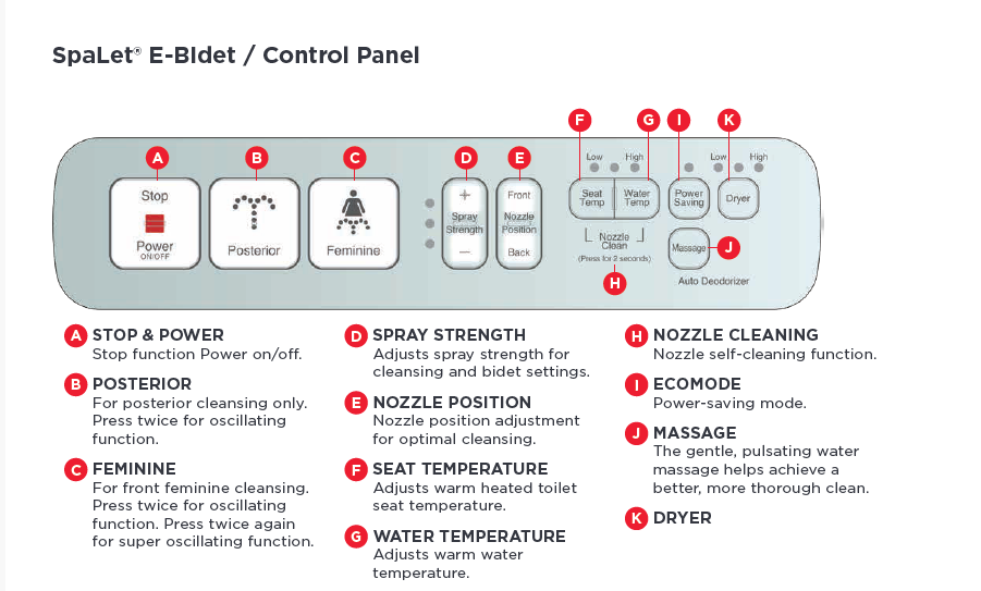 separate posterior and feminine cleansing with self-cleaning nozzles and auto-deodorizer give you the ultimate in hygiene. Personalise you experience with spray strength and nozzle position, seat, water and dryer temperature at the touch of a button control panel.